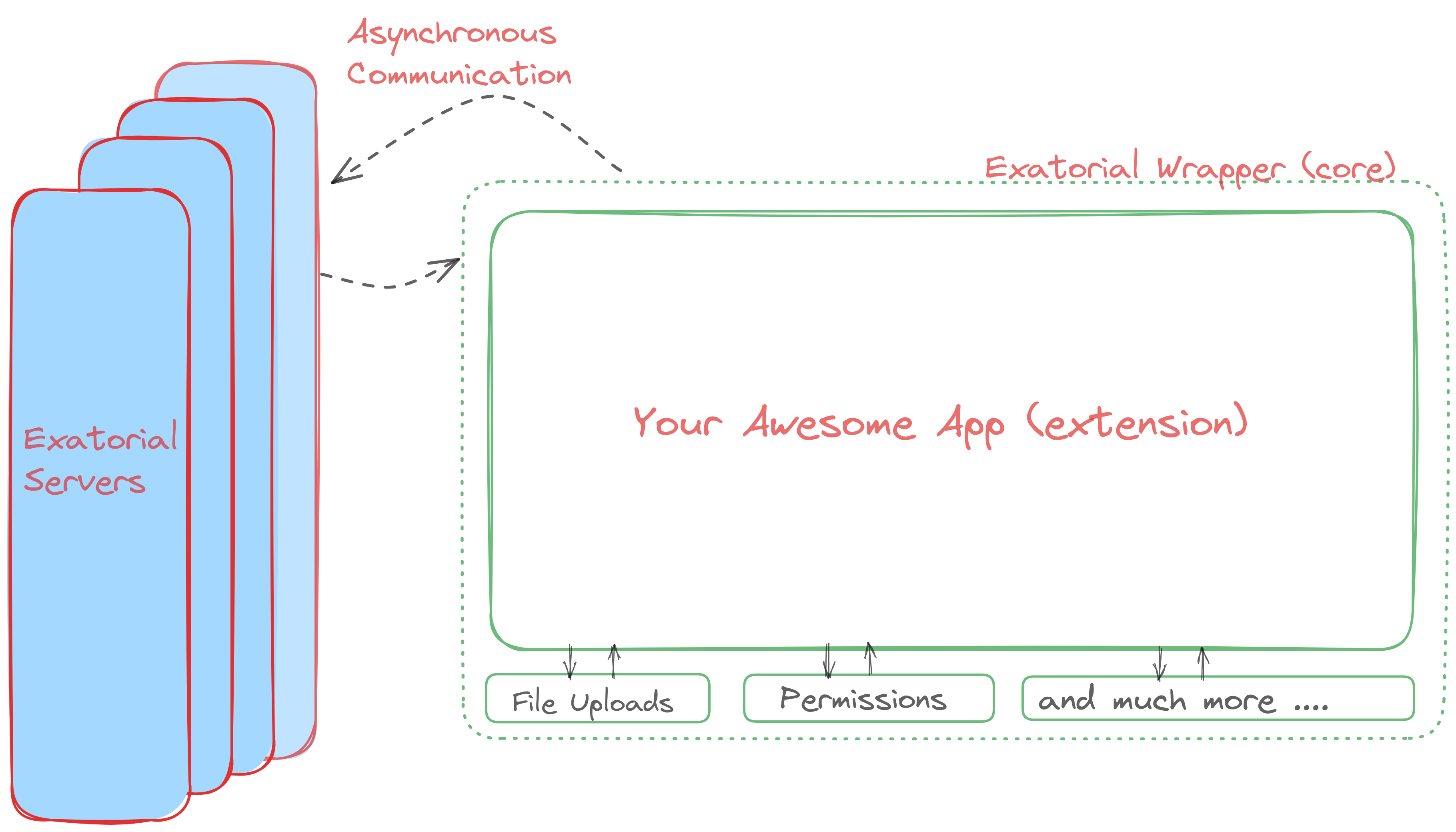 Although Exatorial is an educational-management software as of now, it is never designed to be that way. At its heart, Exatorial is a web-based operating system to power any multi-tenant structure. A very trimmed-down architecture of Exatorial is given below.
